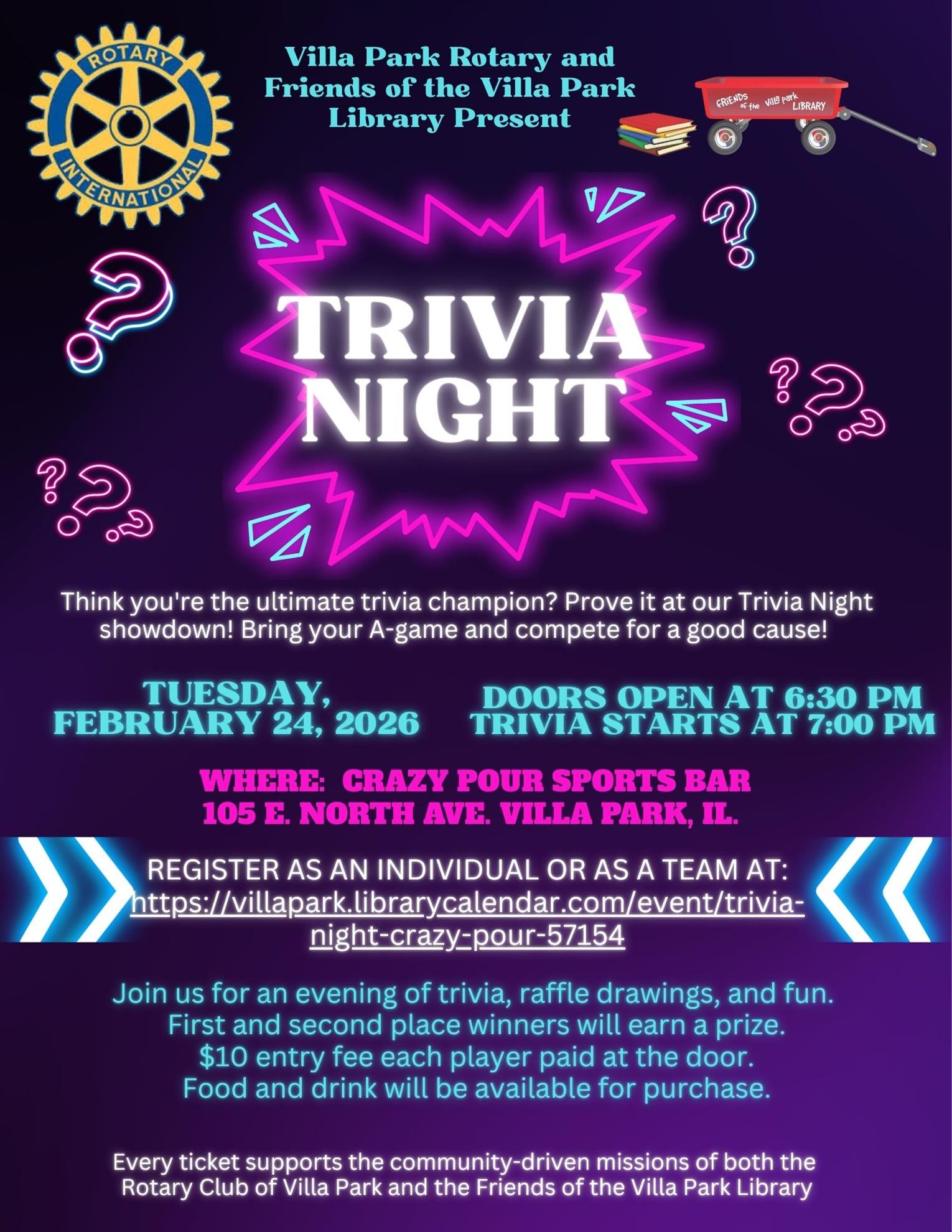 Join us for our Trivia Night Fundraiser. It’s the perfect way to support the Rotary Club of Villa Park and the Friends of the Villa Park Library while having a blast.